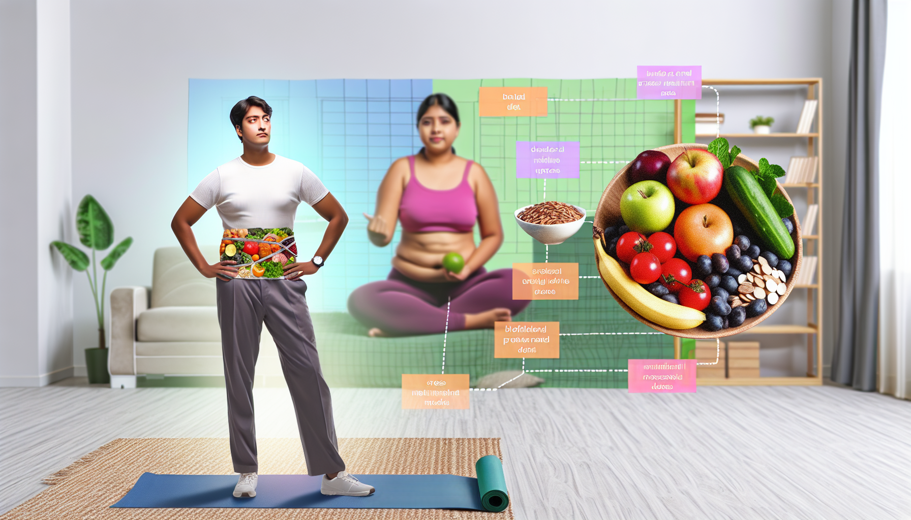 Eine Darstellung von Gesundheit und Wohlbefinden während des Gewichtsverlusts. Visualisieren Sie eine ausgewogene Ernährung mit einer Vielzahl von bunten Früchten und Gemüse, mageren Proteinen und Vollkornprodukten. Zeigen Sie eine Person südasiatischer Abstammung, die regelmäßig Sport treibt. Fügen Sie Elemente im Hintergrund hinzu, die auf Stressbewältigung hinweisen, wie eine Yogamatte, eine beruhigende Umgebung mit Zimmerpflanzen und ein inspirierendes Zitat an der Wand. Die Person strahlt Selbstbewusstsein aus, ist gesund und scheint mit ihren Lebensstiländerungen zufrieden zu sein. Betonen Sie die positiven Auswirkungen dieser Veränderungen auf ihre körperliche und geistige Gesundheit.